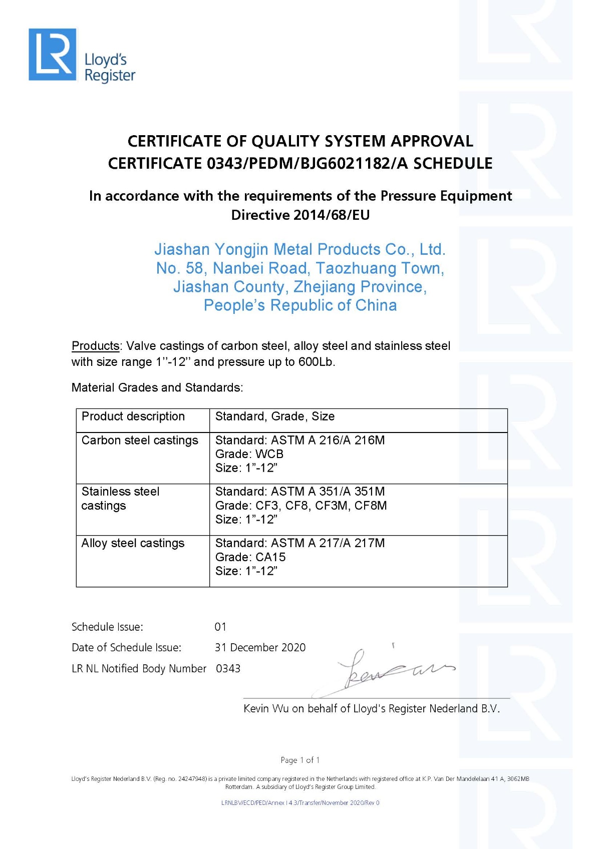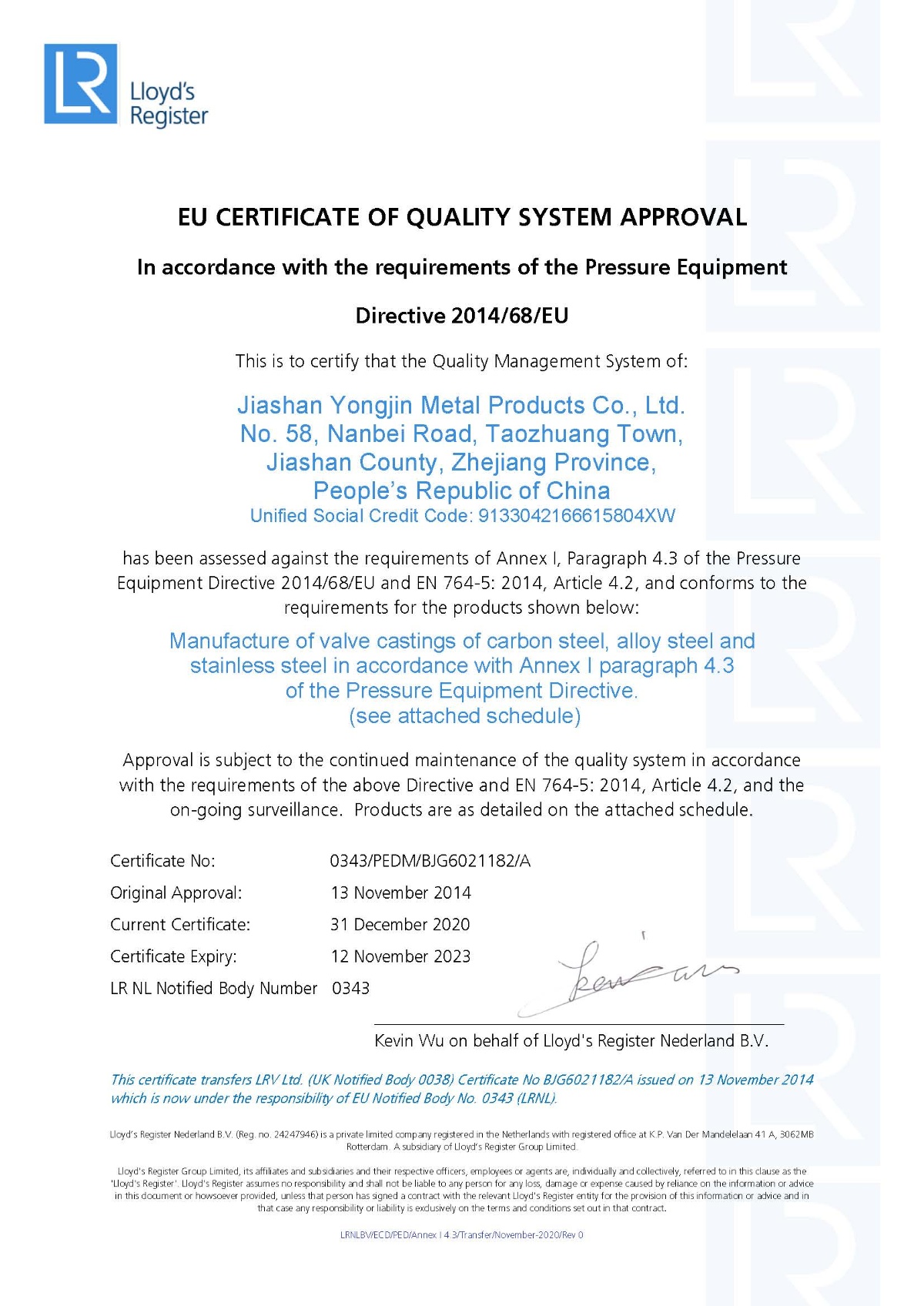 通過(guò)歐盟壓力容器指令PED 2014/68/EC Annex I - 4.3認(rèn)證
